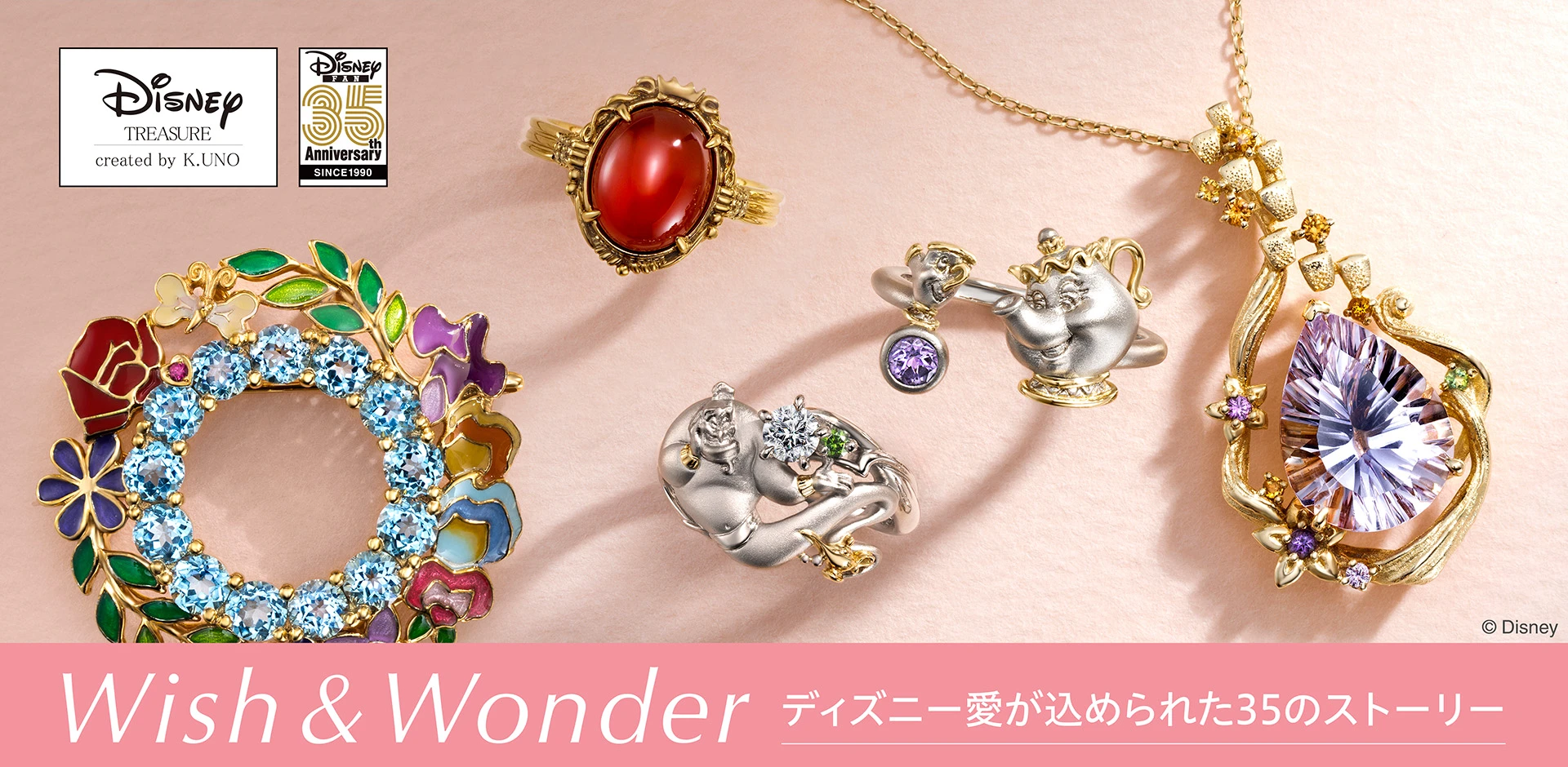 月刊『ディズニーファン』(講談社刊)創刊35周年を記念し集めた、35組のオーダーメイドジュエリー。