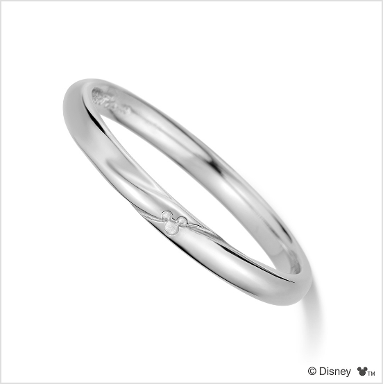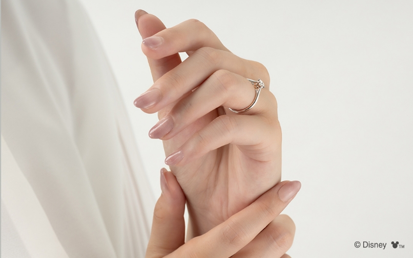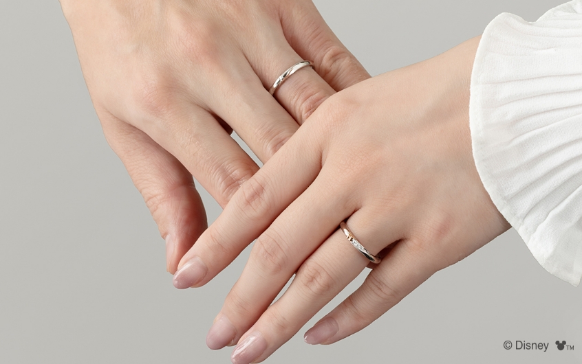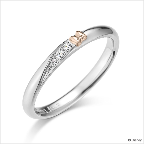 婚約指輪の正面はシンプルに、石座へ「ミニーマウス」の象徴的なリボンをしのばせて。結婚指輪は片方に「ミニーマウス」を象徴するリボンのモチーフをぷっくりとした立体感で表現し、もう一方におそろいの斜めのラインと「ミッキーマウス」のアイコンを小さなくぼみで表現。お仕事やフォーマルなシーンでも身に着けやすいデザイン。