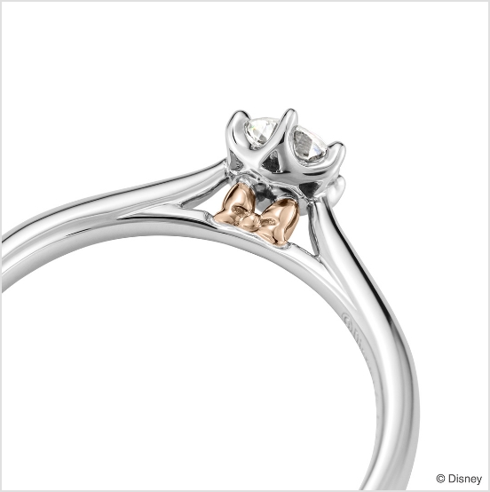 ミッキーとミニーのアイコンをモチーフにデザイン。耳やリボンは、ふっくらと立体感があります。ミニーのリボンにはダイヤモンドを添えて、さりげない華やかさを。