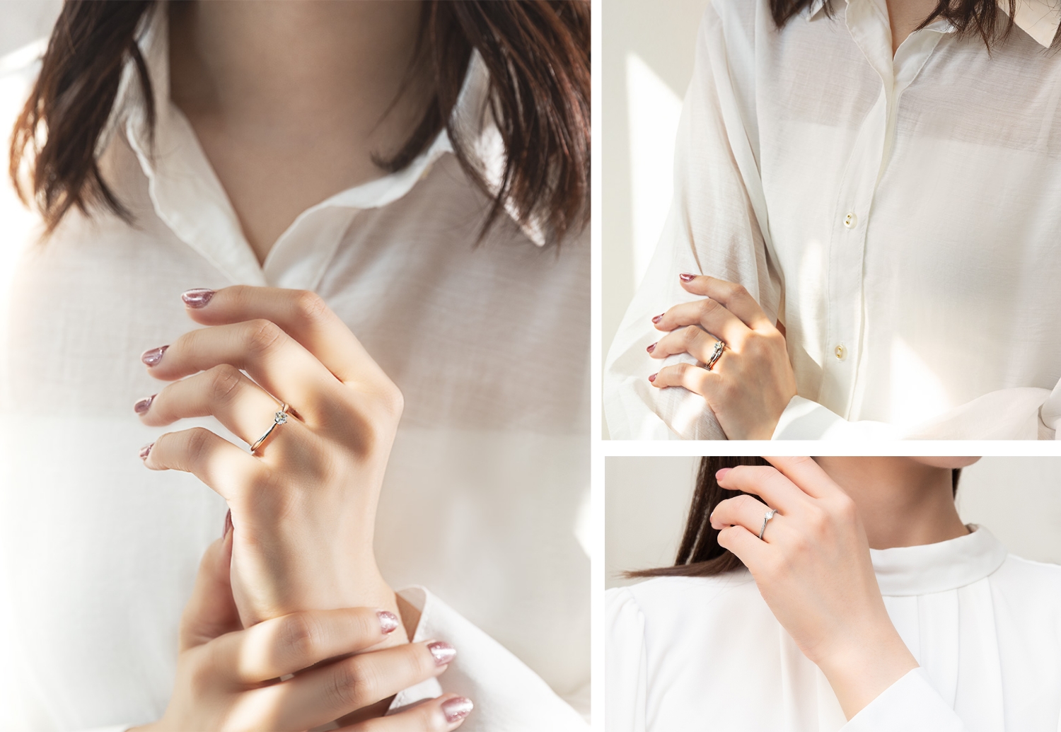 「引っかかりそうで普段使いしづらい」といったイメージを抱えている方にもお選びいただけるよう、通常の婚約指輪のデザインよりも低く抑えたセッティングに。