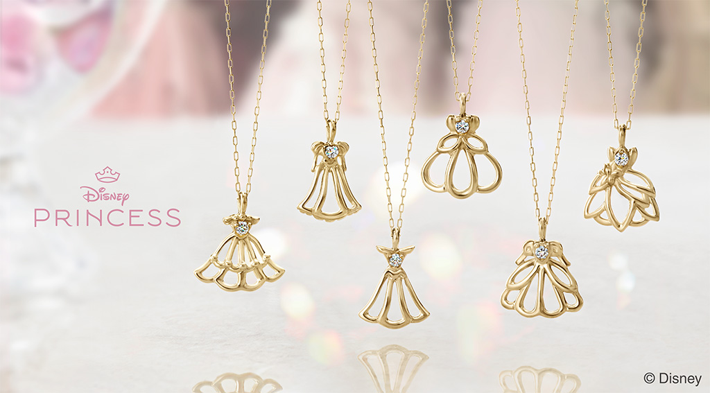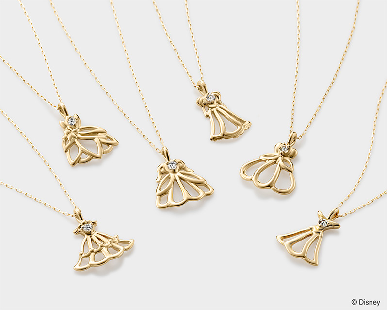 “ドレスをまとう瞬間、世界がきらめく”をコンセプトに、「シンデレラ」「ティアナ」「オーロラ」「ベル」「アリエル」「ラプンツェル」それぞれのディズニープリンセスが身に着けているドレスのシルエットを表現したエレガントなジュエリーです。