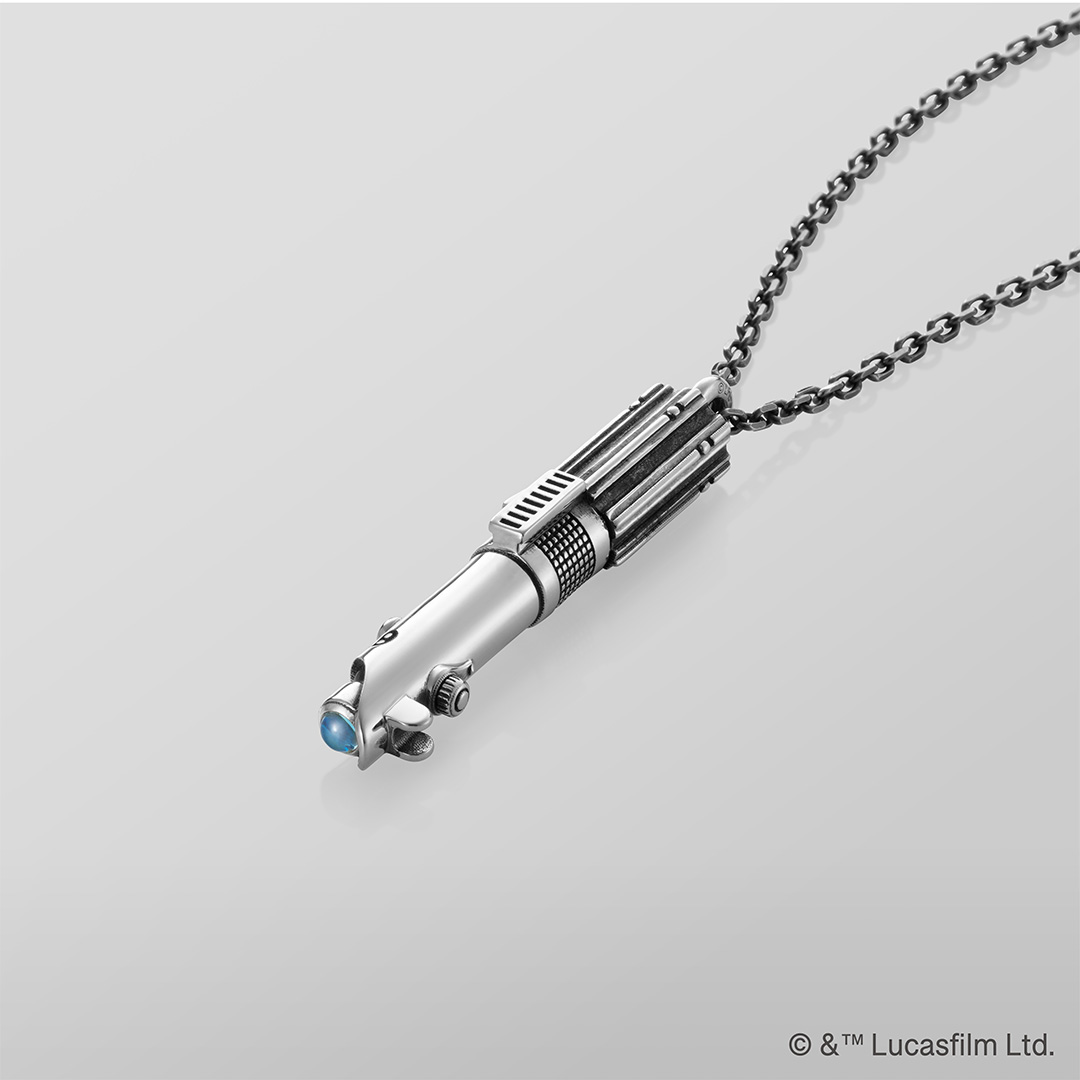 「ライトセーバー」をモチーフにしたネックレスには、それぞれの「カイバー・クリスタル」の色に合わせて天然石をセット。