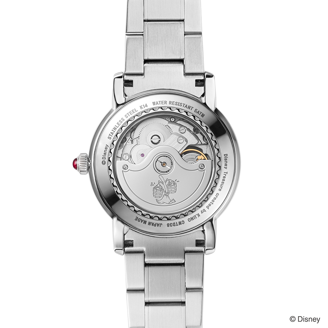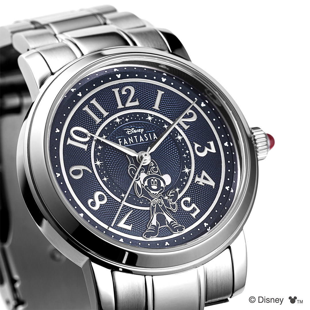 『ファンタジア』の夢と魔法の世界観をつめこんで。 魔法使いの弟子である「ミッキーマウス」の象徴的なポーズを、6時の位置に配置。メタリックな銀色のステンレスケースに、深いネイビーの文字盤でシックな印象に。文字盤にはギョーシェ彫りを施し、高級感のあるデザインに仕立てました。インデックスの書体や、メモリの小さな「ミッキーマウス」のアイコン、きらめく魔法の軌跡など、細部まで作品の世界観が感じられます。