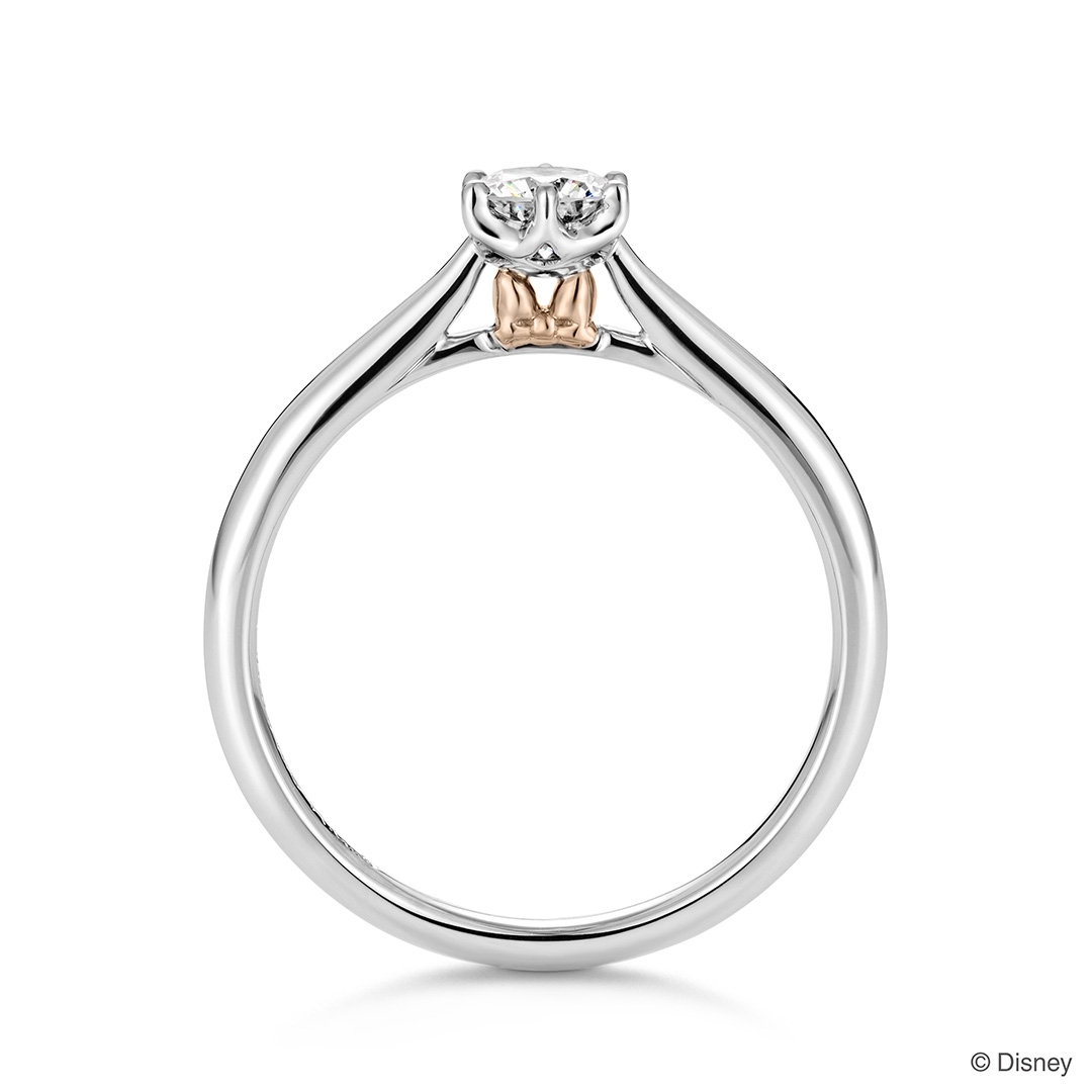 あなたとつながる、ちいさなリボン 「ミニーマウス」をモチーフにした婚約指輪。 正面はシンプルに、石座へ「ミニーマウス」の象徴的なリボンをしのばせて。正統派の6点留めのデザインでありながら、ちらりと覗く側面のピンクゴールドが甘く優しい印象を添えてくれます。 リボンは人と人を結び付ける“絆”や“縁”の象徴とされ、婚約という人生の節目にぴったりのモチーフ。 シンプルなデザインが演出する上品さと、「ミニーマウス」のキュートな魅力を兼ね備えたリングです。