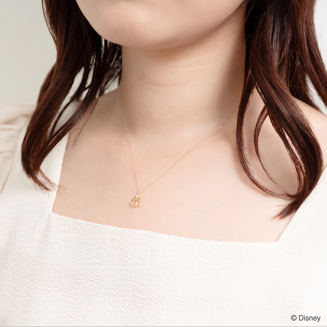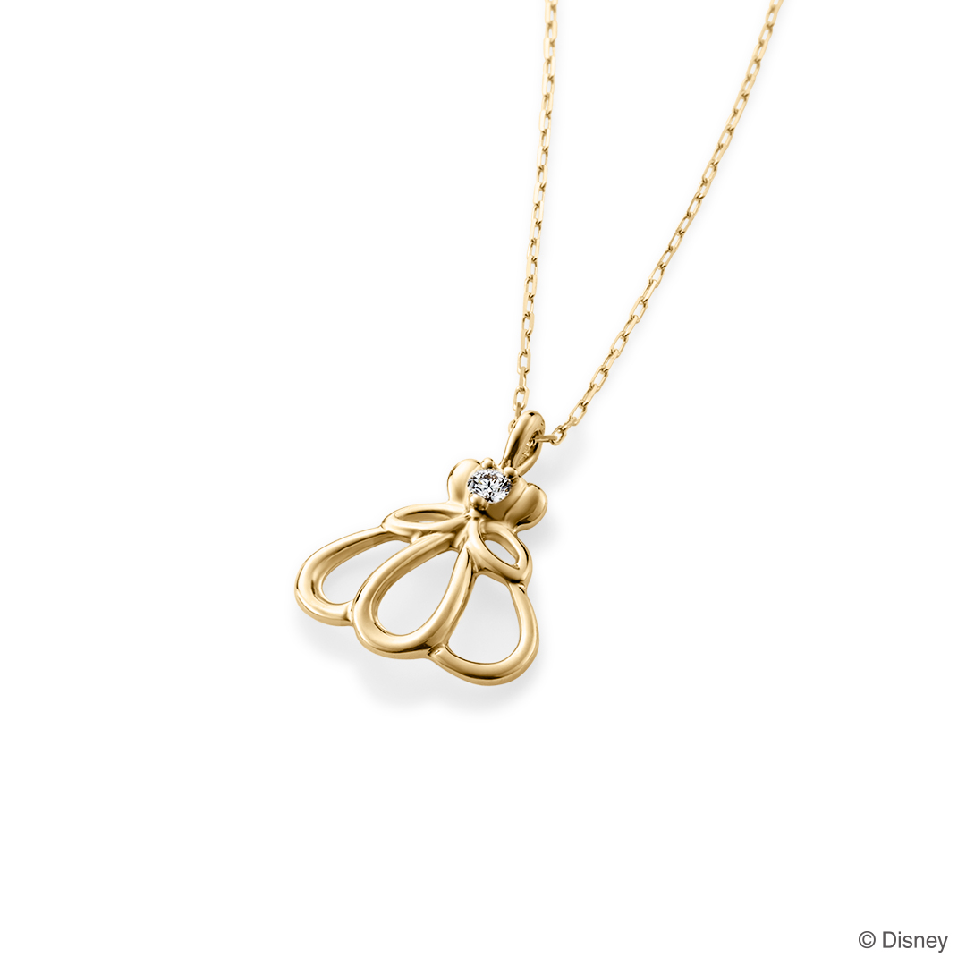 ドレスをまとう瞬間、世界がきらめく 「シンデレラ」「ティアナ」「オーロラ」「ベル」「アリエル」「ラプンツェル」それぞれのドレスがクローゼットにかかっているようなイメージの『Dress me』シリーズ。「シンデレラ」のデザインは、丸みをおびた特徴的なドレスのシルエットを表現。舞踏会のロマンチックなシーンが目に浮かぶようーー。横から見た時にもわずかにアールのついた立体感で、ドレスのふんわりした質感を大切に製作しました。K18イエローゴールドを使用しメレダイヤモンドが輝くネックレスは、上質な素材で永くご愛用いただけます。ホリデーシーズンのギフトをはじめ、ご自身へのご褒美にも最適なアイテムです。