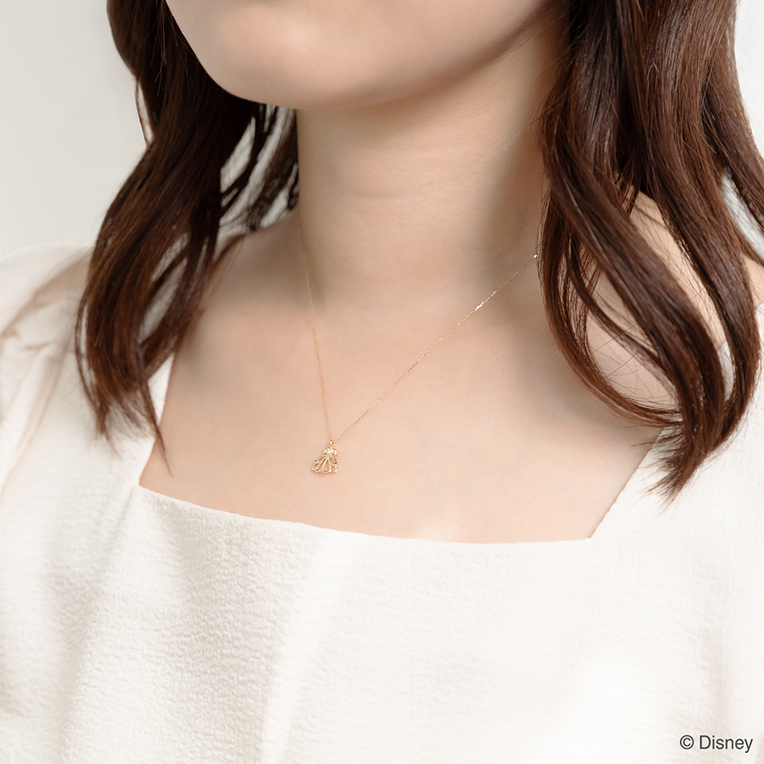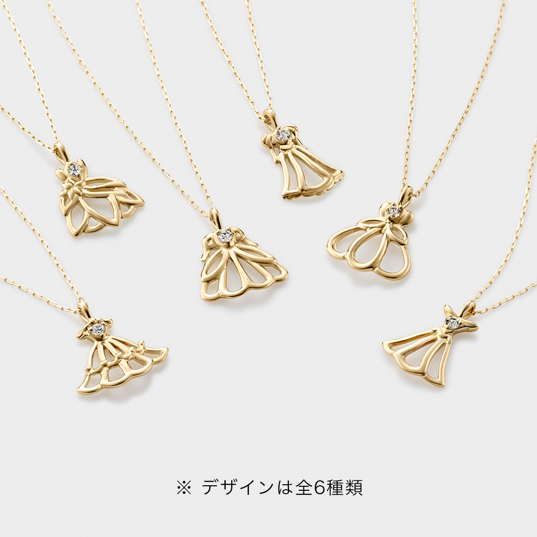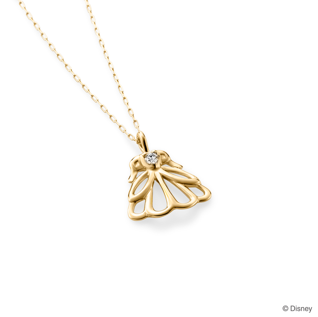 ドレスをまとう瞬間、世界がきらめく 「シンデレラ」「ティアナ」「オーロラ」「ベル」「アリエル」「ラプンツェル」それぞれのドレスがクローゼットにかかっているようなイメージの『Dress me』シリーズ。 「アリエル」のデザインは、ふんわりとしたピンクのドレスをモチーフに。パフスリーブの模様まで、細かな表現にこだわっています。 横から見た時にもわずかにアールのついた立体感で、ドレスのふんわりした質感を大切に製作しました。K18イエローゴールドを使用しメレダイヤモンドが輝くネックレスは、上質な素材で永くご愛用いただけます。ホリデーシーズンのギフトをはじめ、ご自身へのご褒美にも最適なアイテムです。