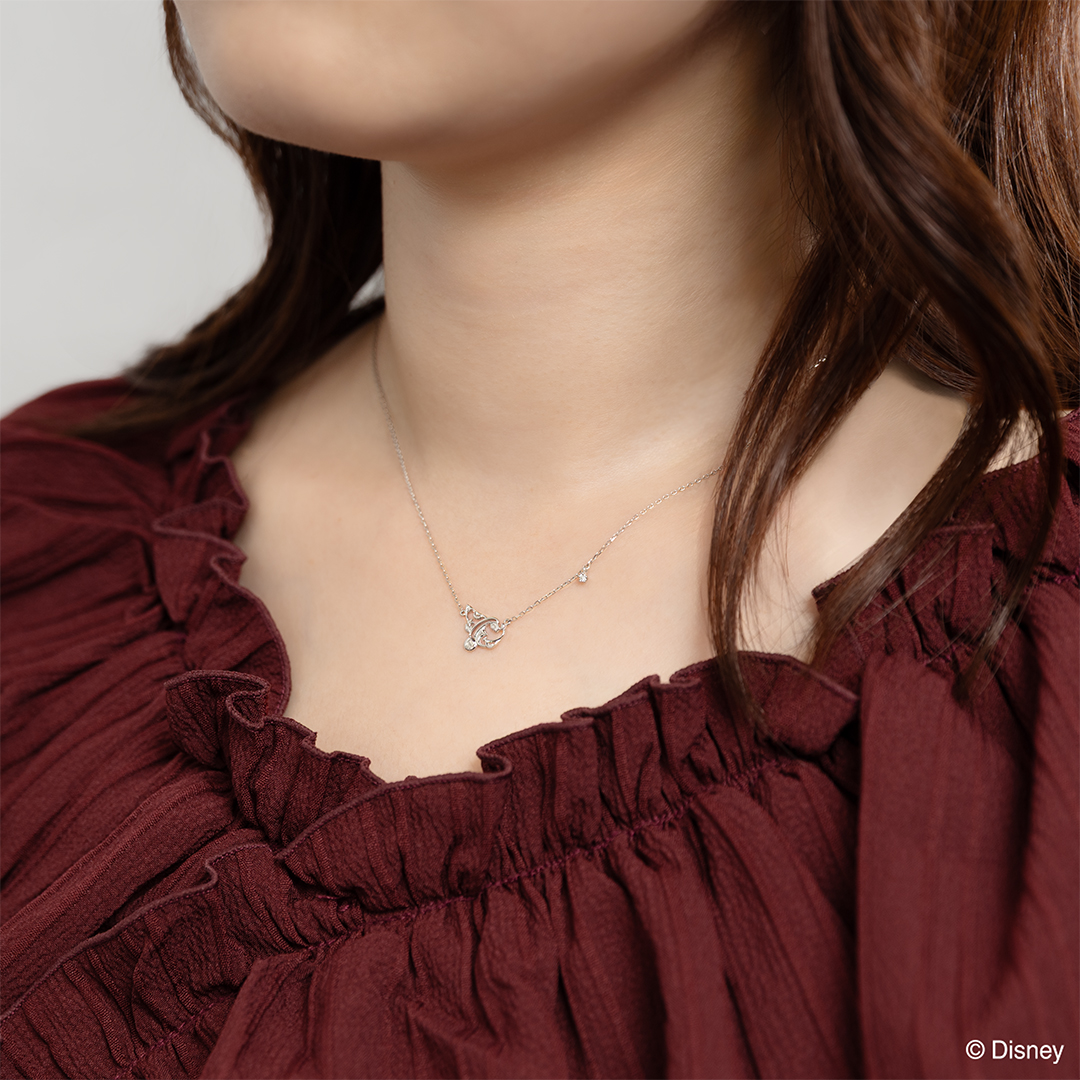 魔法のリズムが鳴り響く、心おどる瞬間を身にまとって ディズニー・アニメーション映画『ファンタジア』に登場する「ソーサラーハット」をかぶった「ミッキー」の姿を楽しめるネックレス。「ミッキー」の目線の先には、5点の爪留めで星をイメージしたダイヤモンドが輝きます。上質なプラチナを使用し、永く愛せるネックレスに仕立てました。デイリーに楽しめるサイズ感でありながら、繊細な透かしの作りで「ミッキー」の表情や帽子の模様まで細やかに表現。オーダーメイドで培ったケイウノならではの技術がぎゅっとつめこまれたネックレスです。