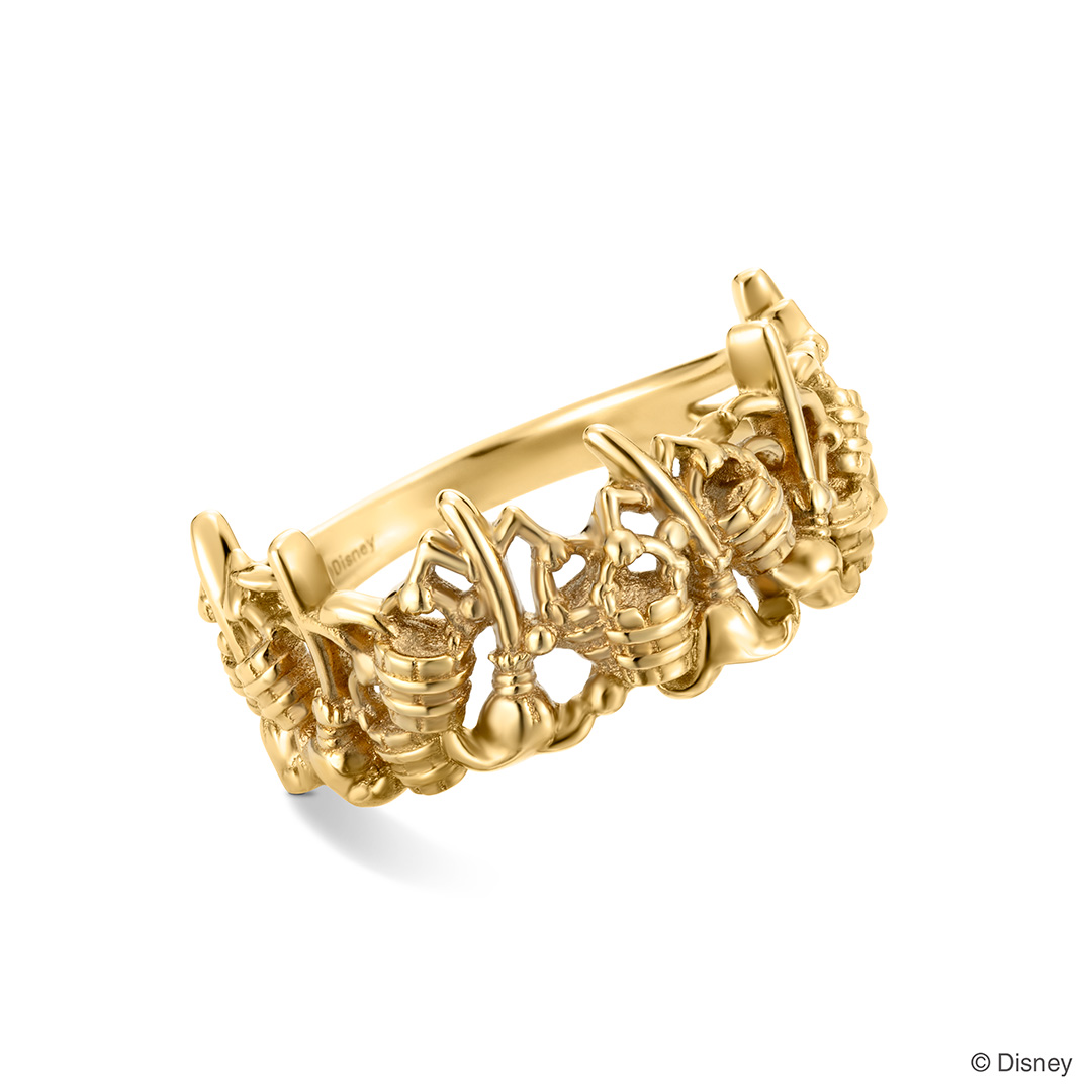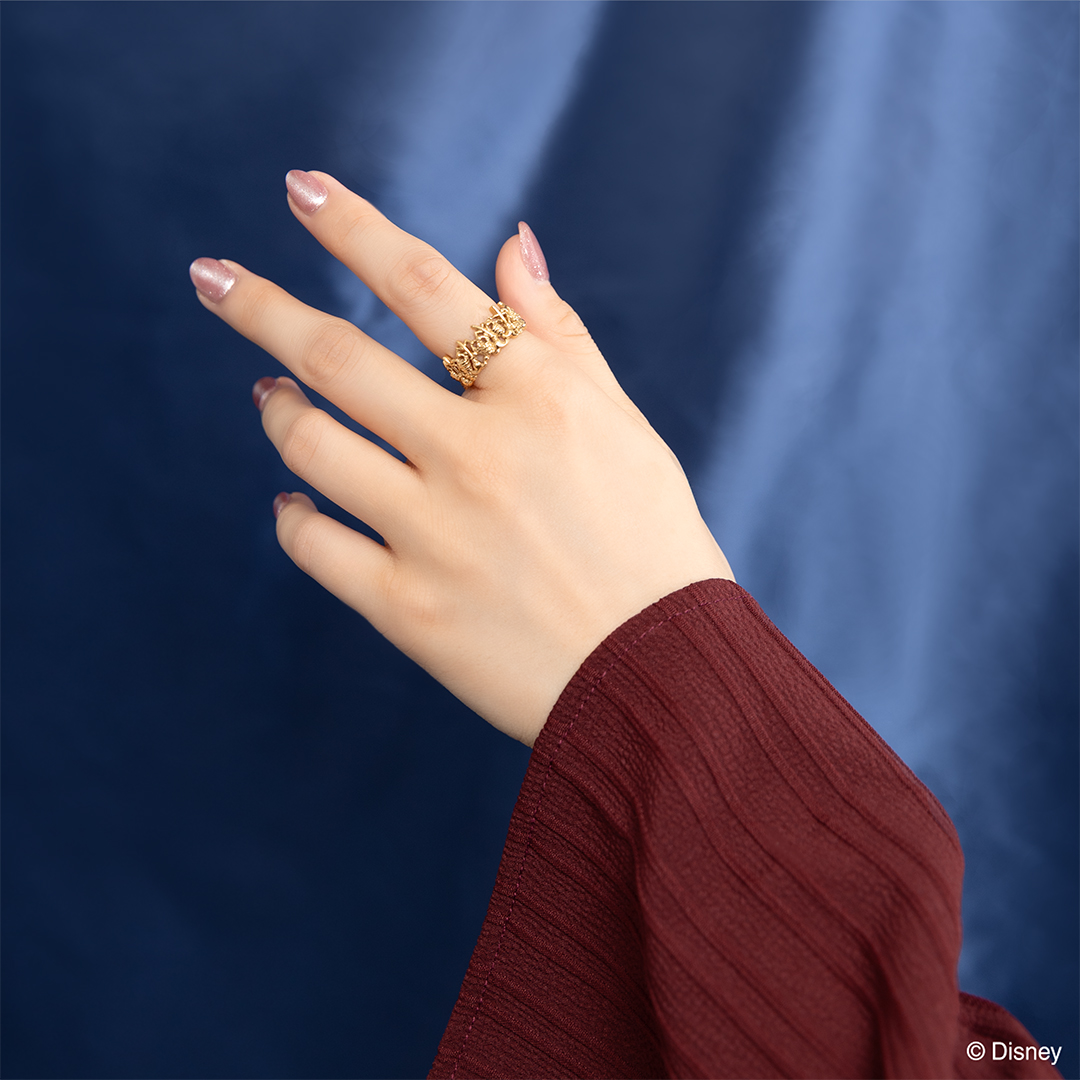 魔法のリズムが鳴り響く、心おどる瞬間を身にまとって ほうき達が水を運ぶ名シーンをモチーフにしたリング。列を成して水を運ぶ様子を、ぐるりと並ぶほうき達で表現しました。「ミッキー」が慌てふためく作中の印象的なシーンが目に浮かぶ、遊び心あるファッションリングです。 シルバーにイエローゴールドコーティングを施した仕様で、カジュアルに楽しめます。オーダーメイドで培ったケイウノならではの立体表現を楽しめる、存在感あるデザインです。
