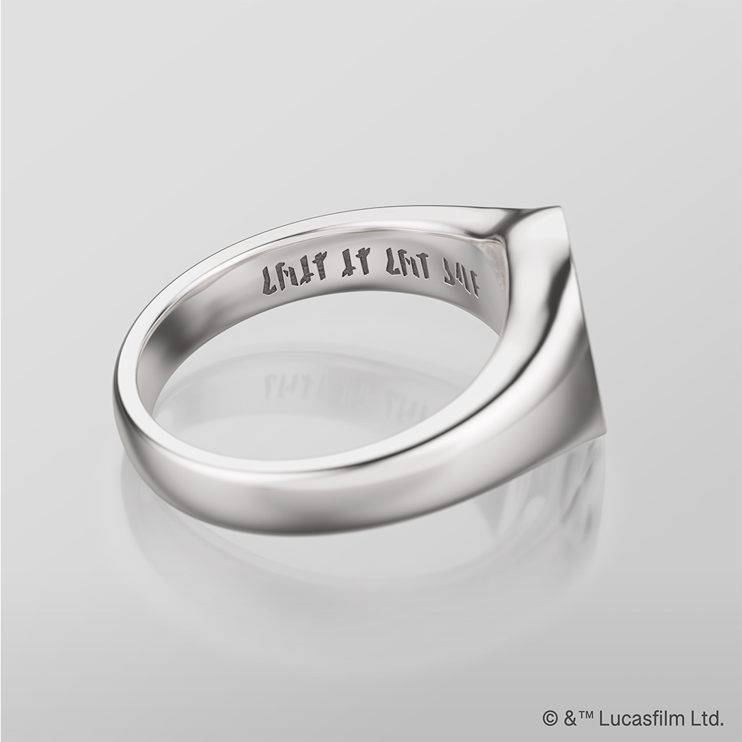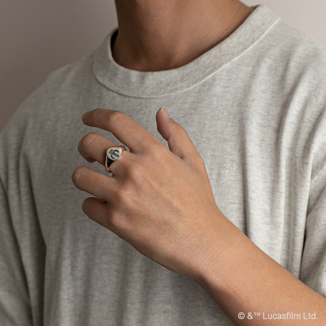すべては、マンダロアのために 伝説の獣「ミソソー」をモチーフにしたシグネットリング。いぶし加工による深みのある表情が、力強く無骨な世界観を引き立てます。内側には「マンダロリアン文字」で「THIS IS THE WAY」を刻印し、作品の象徴的なメッセージを忠実に表現。正面幅は約1.2cmで、コンパクトながら存在感のある仕上がりです。