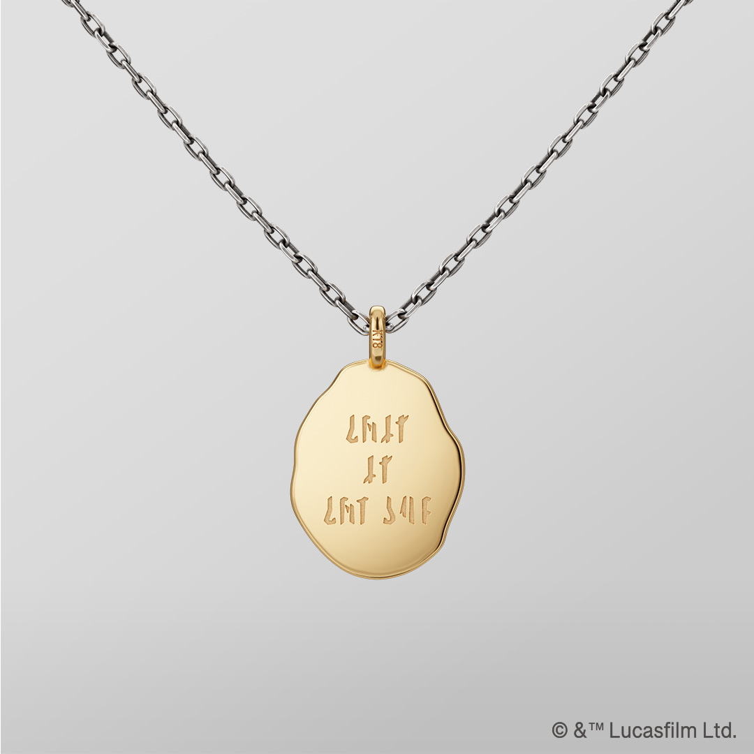 すべては、マンダロアのために 「ミソソー」を立体的に表現した、K18イエローゴールドとシルバーのコンビネーションネックレス。マット仕上げの後に軽く磨きを施すことで、立体感を際立たせた上質な質感に仕上げました。裏面には「THIS IS THE WAY」を「マンダロリアン文字」で刻印。縦幅約1.35cmで、胸元に確かな存在感をもたらします。