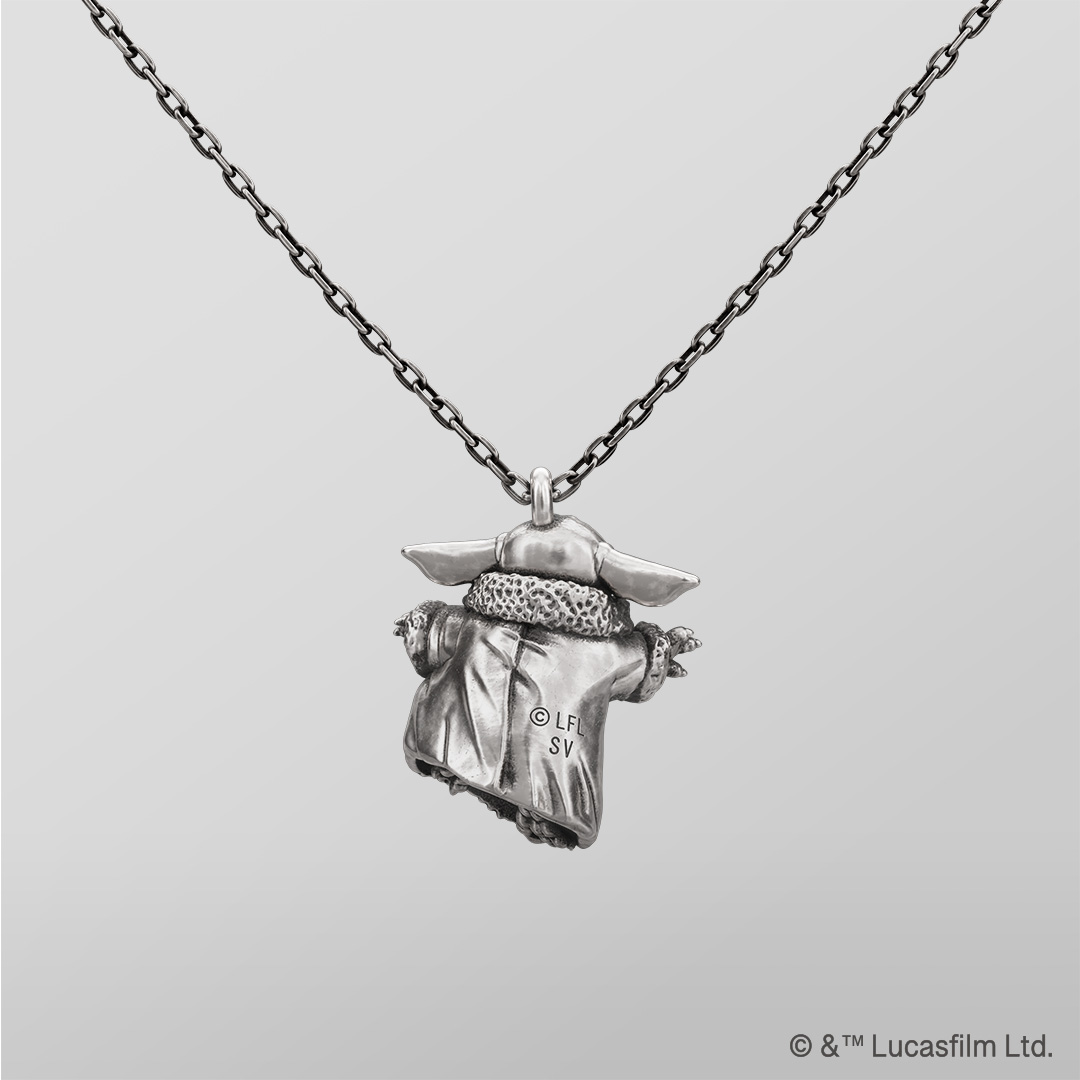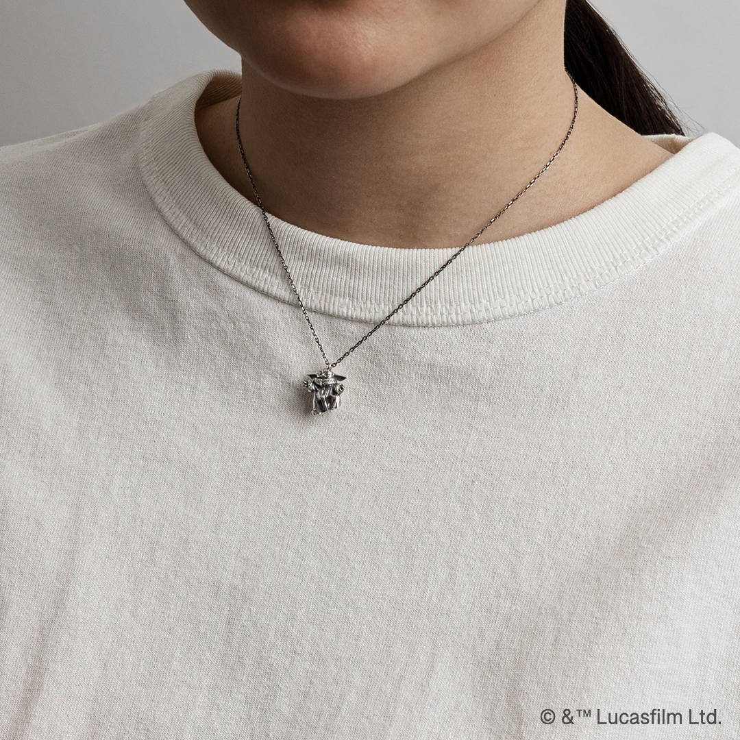 あなたの旅に寄り添うグローグー。 彼の“お気に入り”をしのばせて 約1.5cmサイズで立体的に造形した「グローグー」のネックレス。オーダーメイドブランドならではの緻密な技術で、キャラクターの愛らしさを360度から楽しめるよう表現しました。いぶし加工後に軽く磨きをかけ、立体感を際立たせた深みのある仕上がりに。バックチャームには、「グローグー」の“お気に入り”であるカエルのモチーフをさりげなく配置しています。