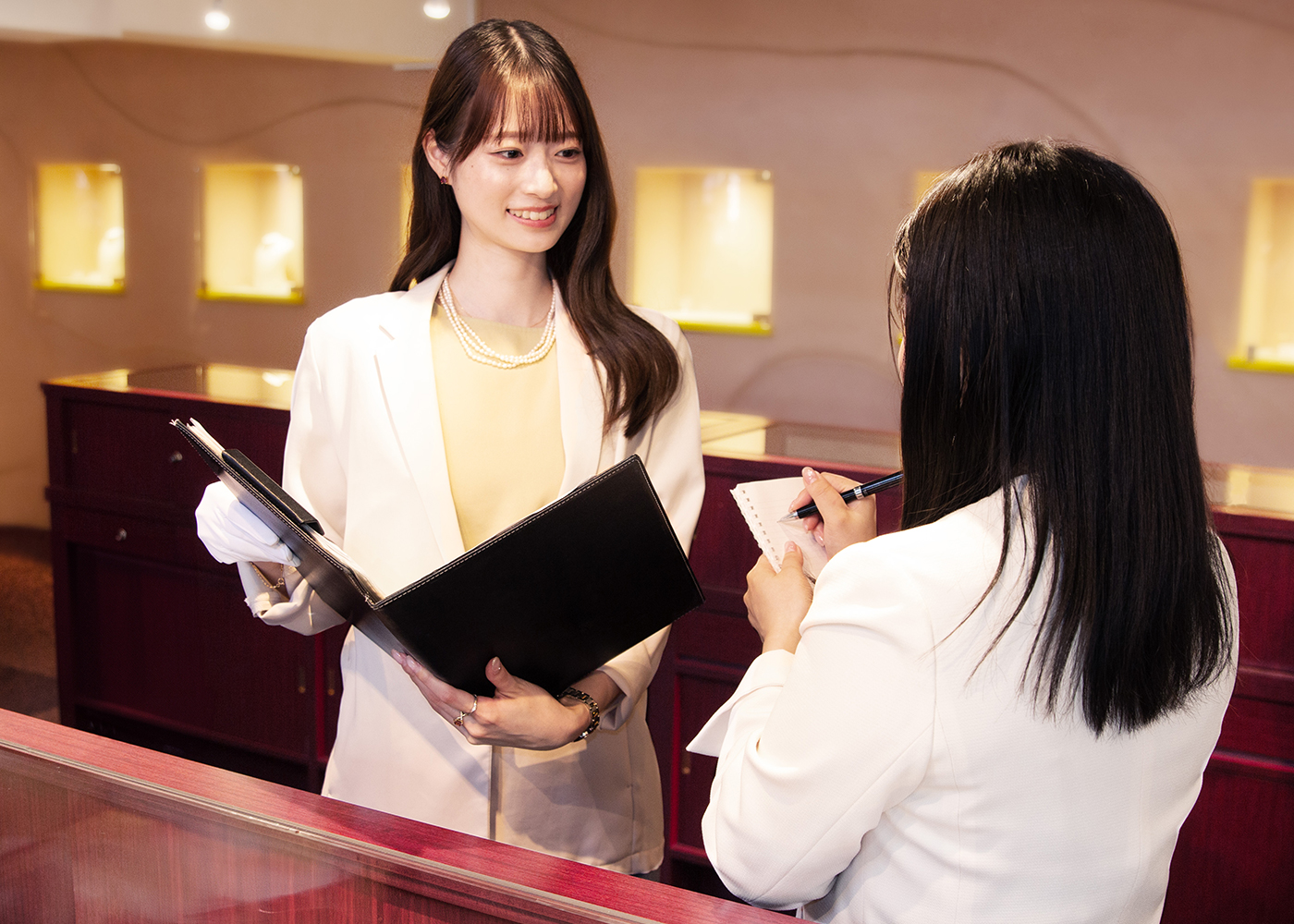 店頭スタッフとして、お客様一人ひとりの想いに寄り添い、理想のジュエリーをご提案しています。