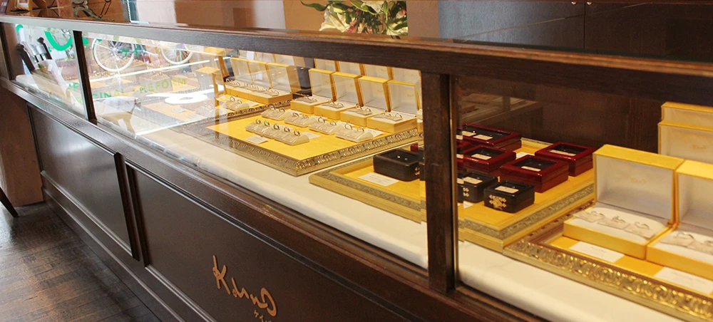 アットホームな雰囲気のワンフロアの広々とした空間に、結婚指輪や婚約指輪などのブライダルリングからファッションジュエリーまでジュエリーを豊富に取り揃えております。