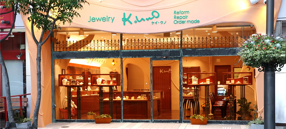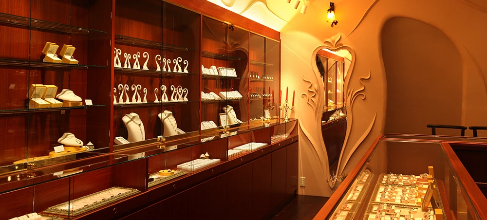 一面ガラス張りの明るい店内には、結婚指輪や婚約指輪などのブライダルリングからファッションジュエリーまでジュエリーを豊富に取り揃えております。
