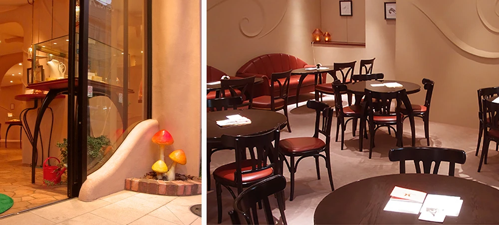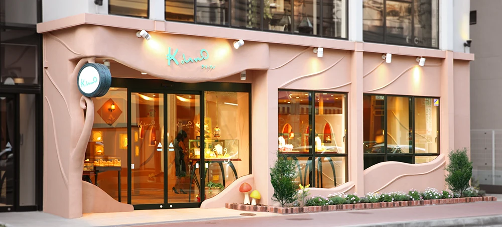 サーモンピンクの壁と店前に並ぶ3本のキノコのオブジェがお客さまをお出迎えいたします。