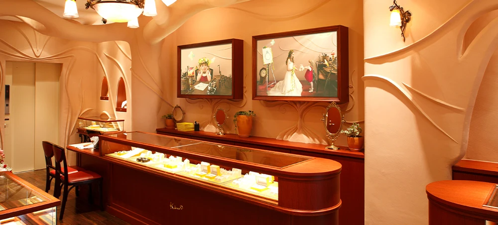 自然の美しさを感じるデザインが散りばめられた店内には、結婚指輪や婚約指輪などのブライダルリングからファッションジュエリーまでジュエリーを豊富に取り揃えております。
