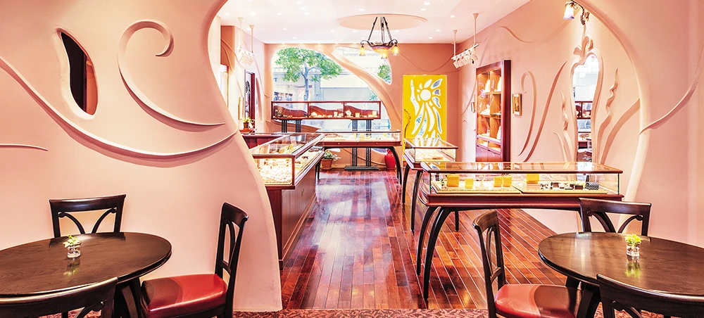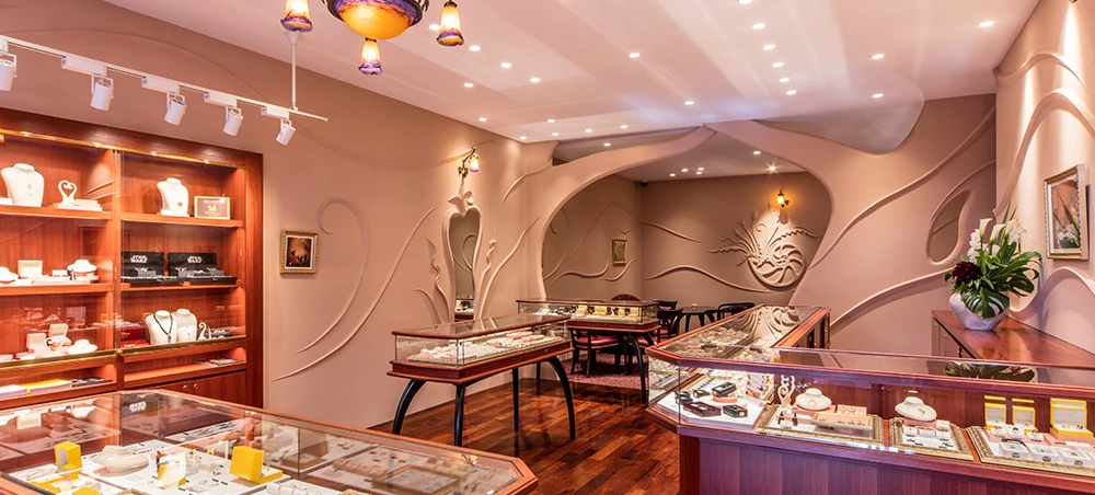 ワンフロアで商品が見やすい店内には、結婚指輪や婚約指輪などのブライダルリングからファッションジュエリーまでジュエリーを豊富に取り揃えております。